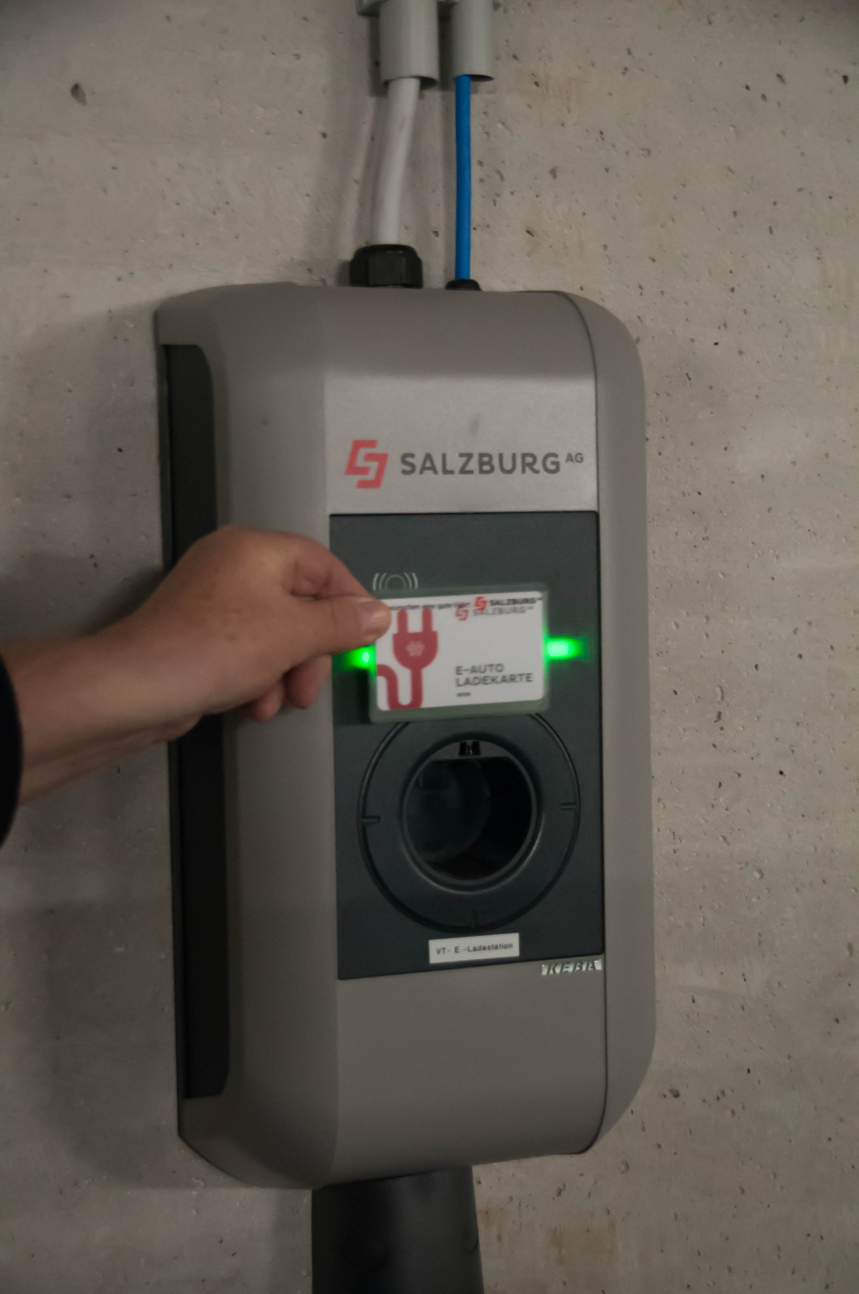 Mit der im Handschuhfach hinterlegten Ladekarte kann das an sämtlichen öffentlich zugänglichen Ladestationen der Salzburg AG geladen werden. Darüber hinaus kann bei sämtlichen Gratis-Ladestationen geladen werden